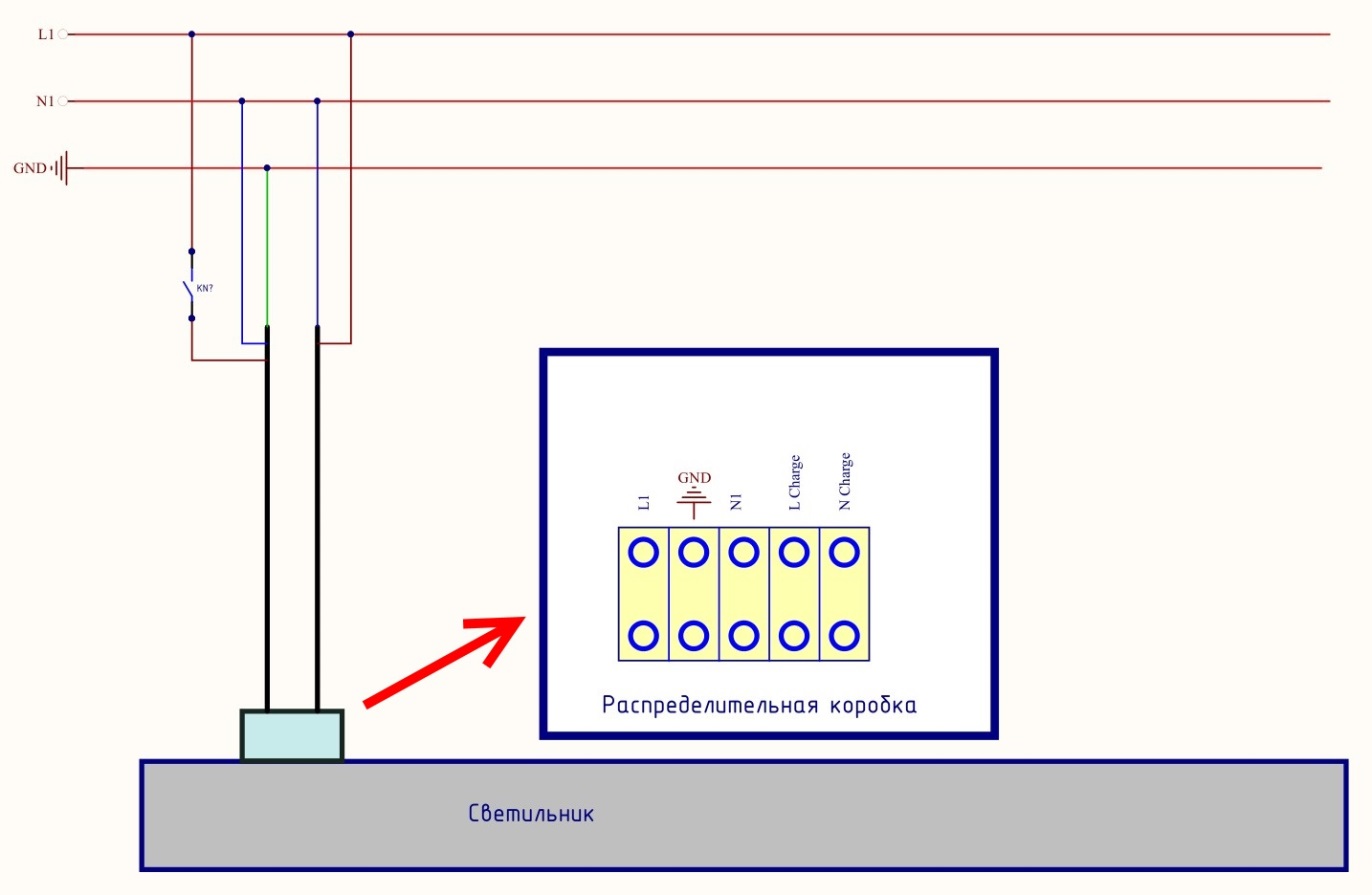 Светильник с ИБП имеет расширенную клемму подключения к сети питания 220 VAC (Рис 1). Контакты L1 и N1 подключаются через выключатель к линии 220 VAC и используются для основного освещения со стандартной яркостью. Контакты Lcharge и Ncharge подключаются без выключателей к аварийной линии или линии, на которой подключен светильник. Контакт GND используется для заземления светильника.
